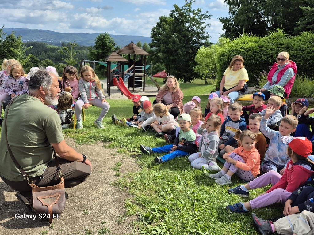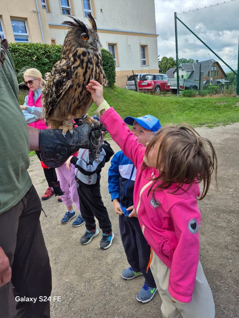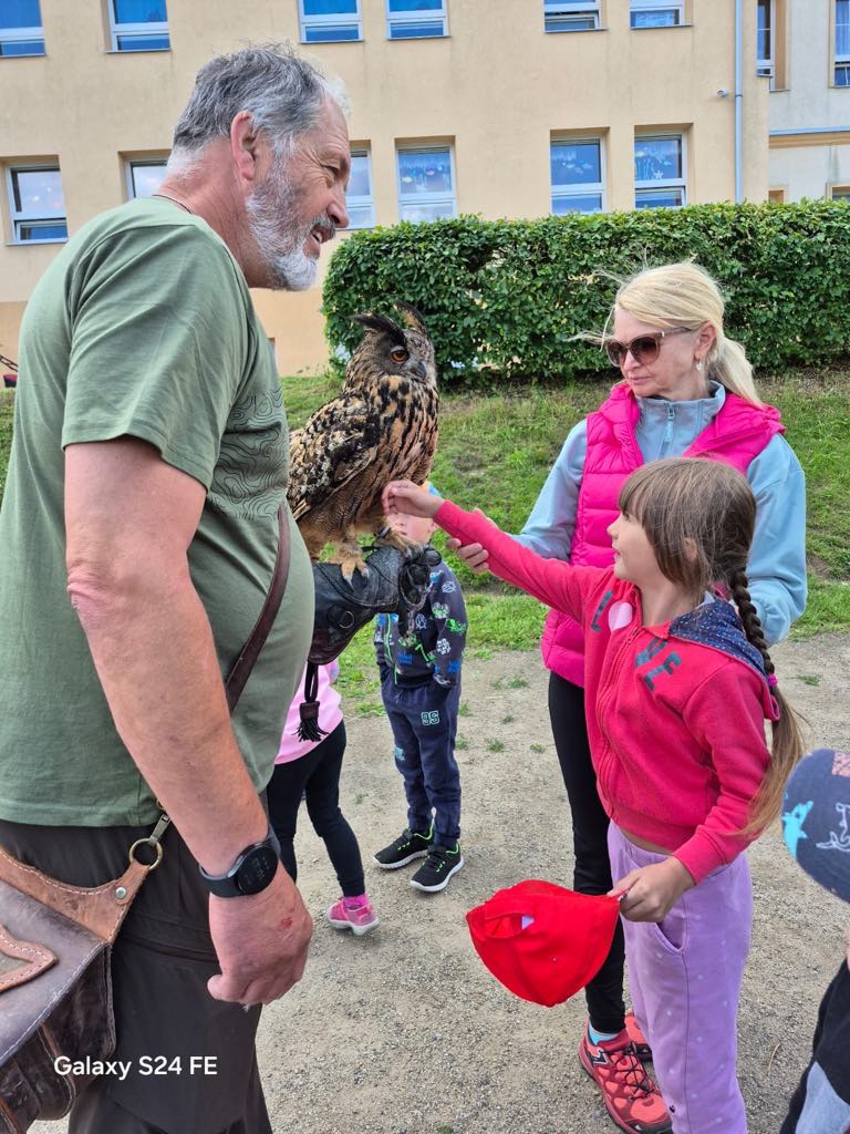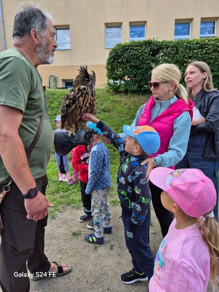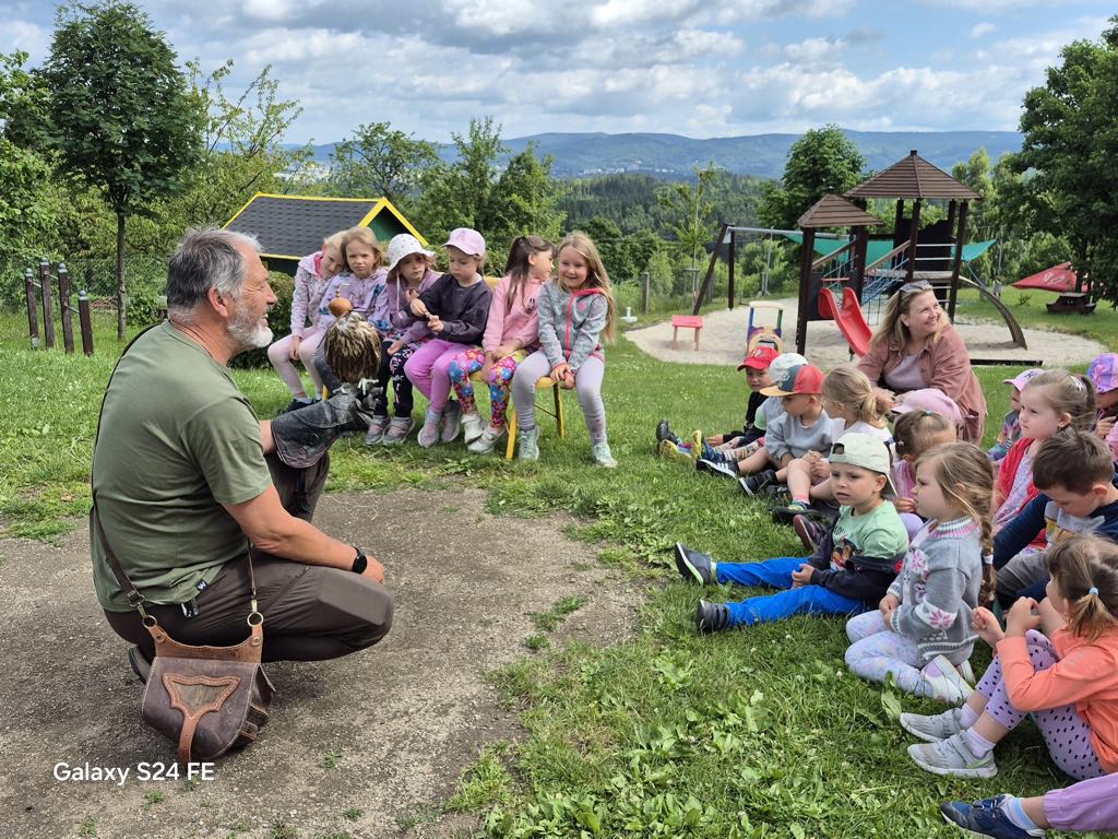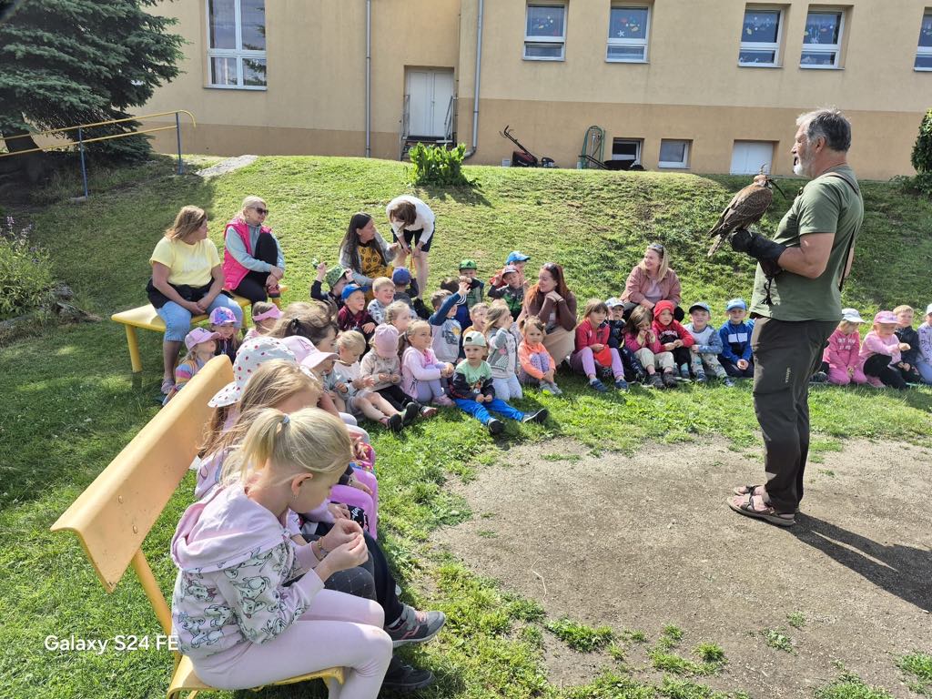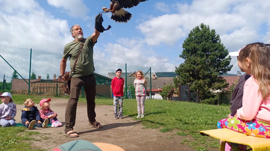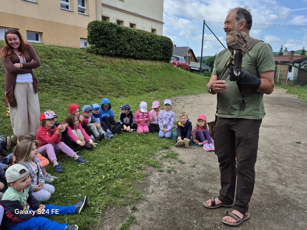 V úterý 24. 6. za námi do mateřské školy přijel pan Milan Straka, sokolník ze Sychrova, který dětem ukázal své dravce a seznámil je s jejich životem.