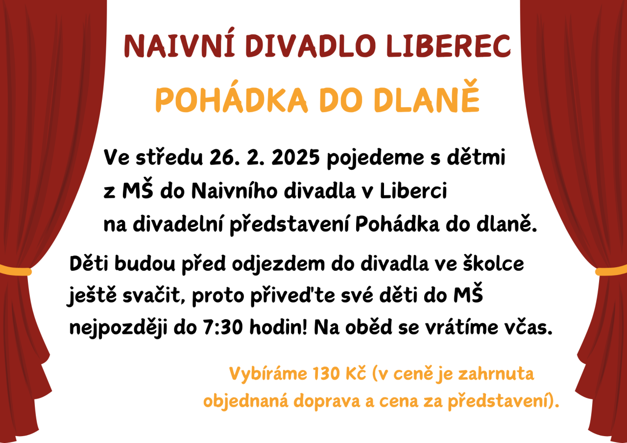 Ve středu 26. 2. pojedeme s dětmi ze všech tříd do Naivního divadla v Liberci na představení Pohádka do dlaně.
