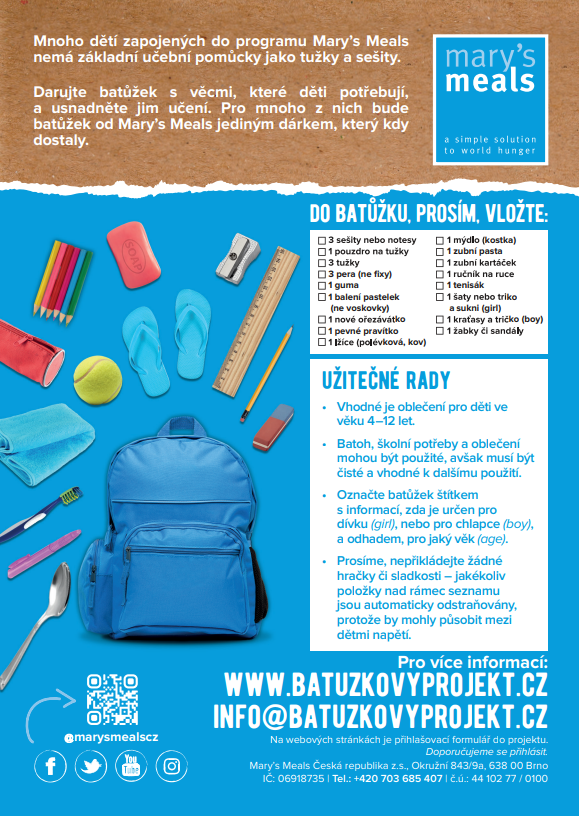 Batůžkový projekt je určený pro školy, školní třídy nebo dětské kolektivy. Děti z České republiky se zapojí do přípravy batůžků pro kamarády v africkém Malawi. Žáci v tamních školách Mary's Meals často nemají ani základní učební pomůcky jako jsou sešity a tužky. Darované batůžky s těmito potřebnými věcmi jim tak mohou usnadnit učení. Pro mnoho dětí to bude jediný dárek, který kdy dostanou.