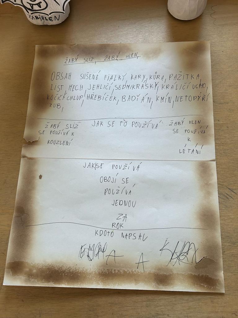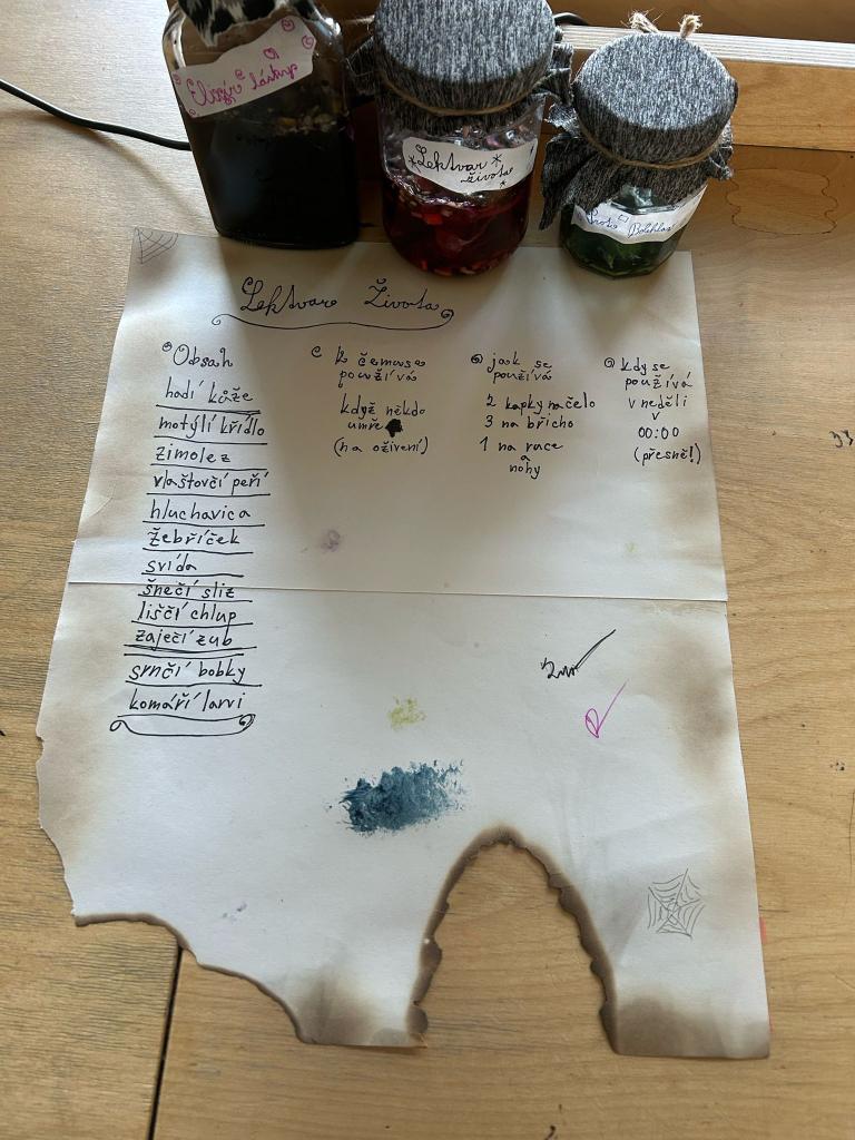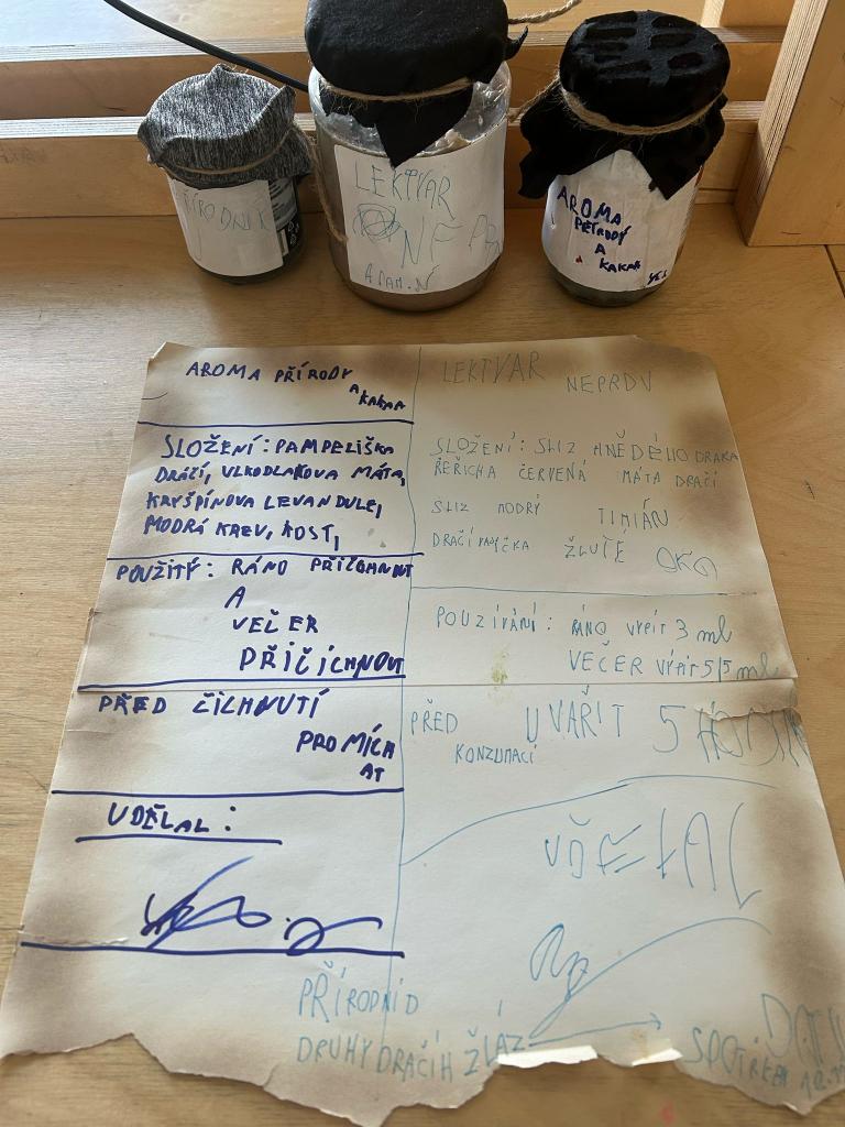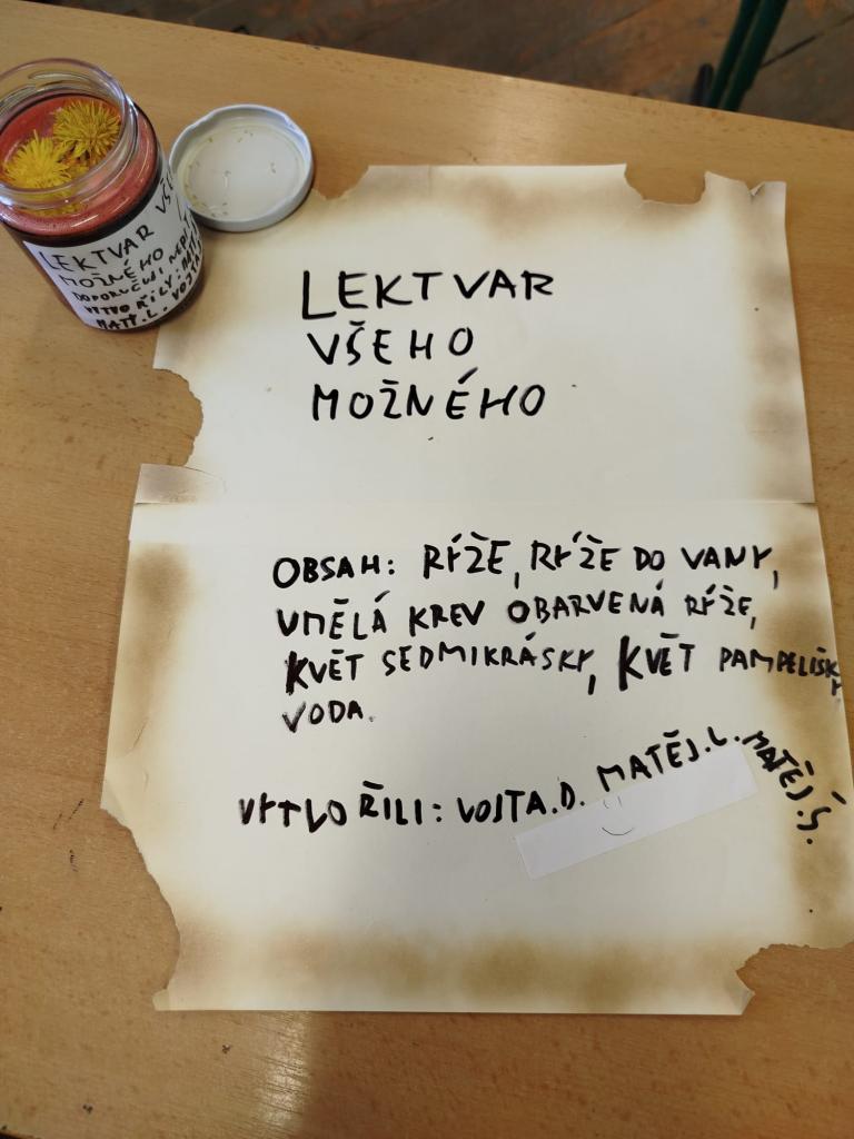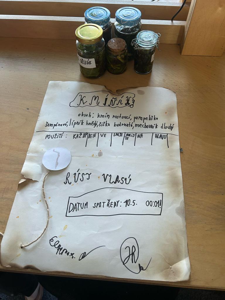 Na začátku projektu si čarodějnice umíchaly čarodějnické lektvary z různých ingrediencí s čarovnou mocí. Ke každému lektvaru si vyrobily pergamen s recepturou a s popisem na co a jak se má užívat. Následovala společná písnička s dětmi z MŠ a všichni jsme si pochutnali na buřtech, které pro nás připravily pani kuchařky. Pak nás čekala pod školou na louce Čarodějnická stezka, kde si žáci plnili spoustu čarodějnických úkolů a pohybových aktivit.